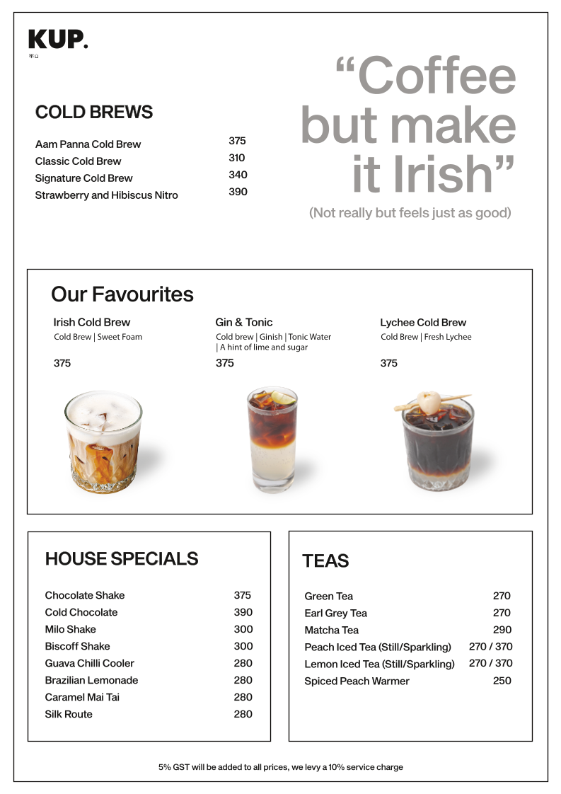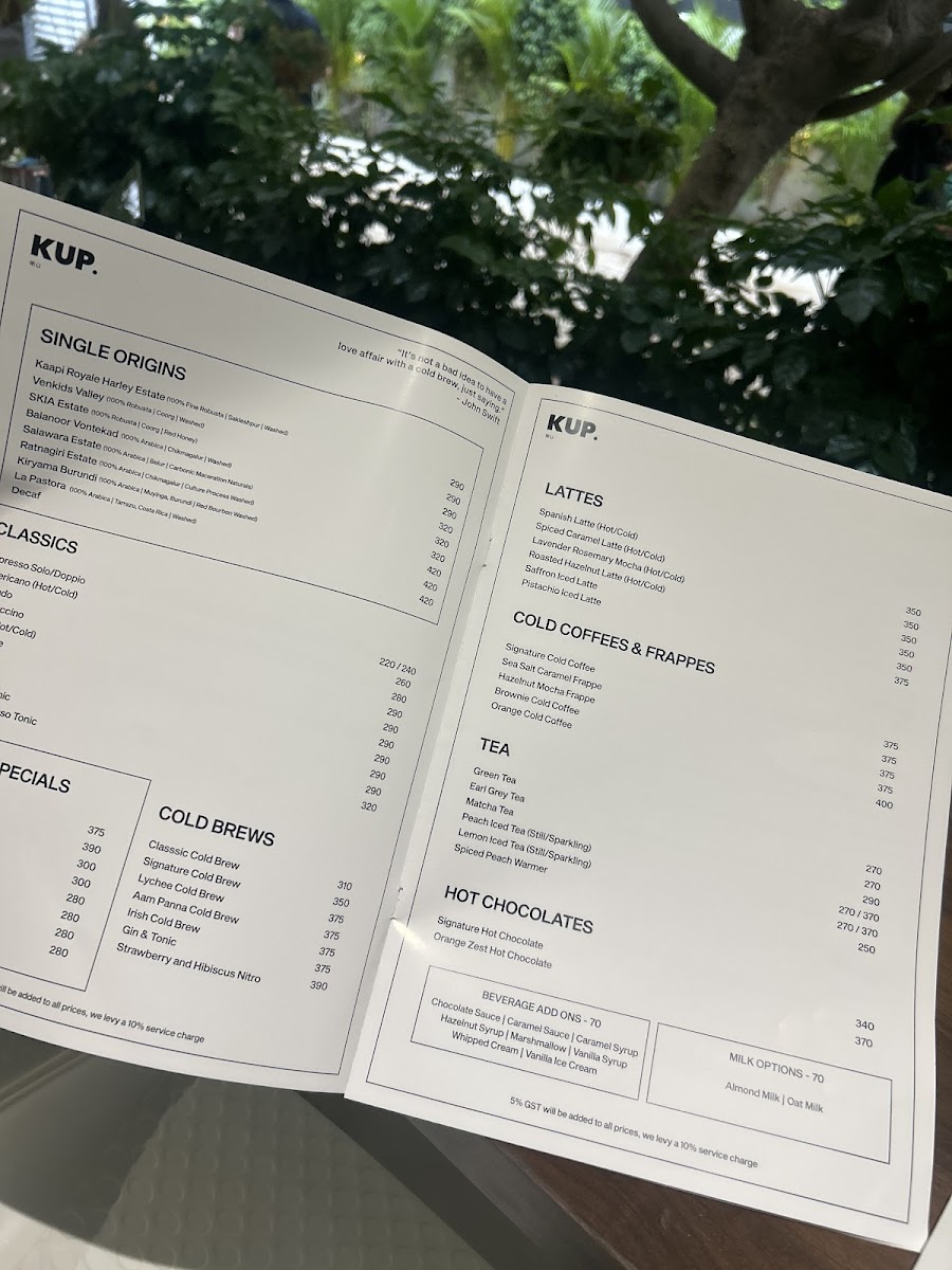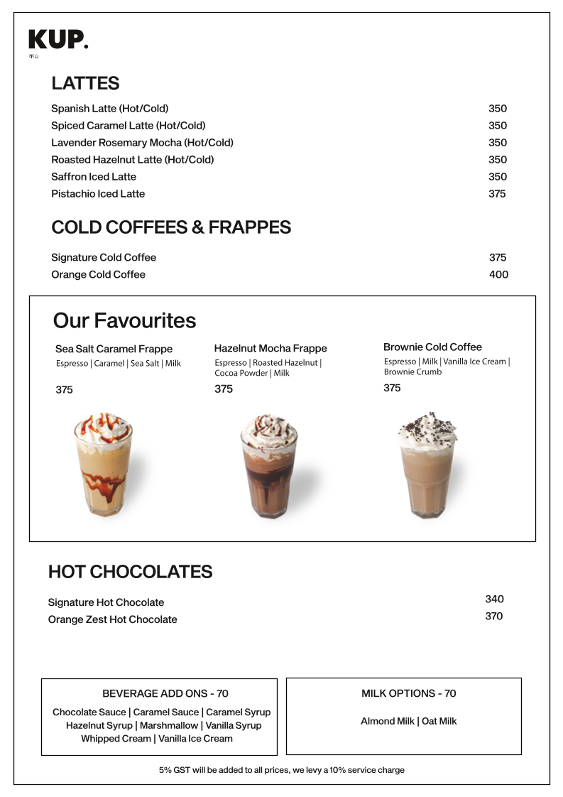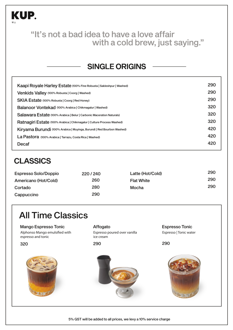 The menu at KUP Budan House - Alwarpet features a range of options suitable for coffee breaks, light meals, and casual dining. It is organized into distinct sections including snacks, cold brews, specialty coffee-based beverages, and select favorite items.